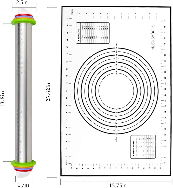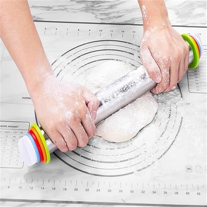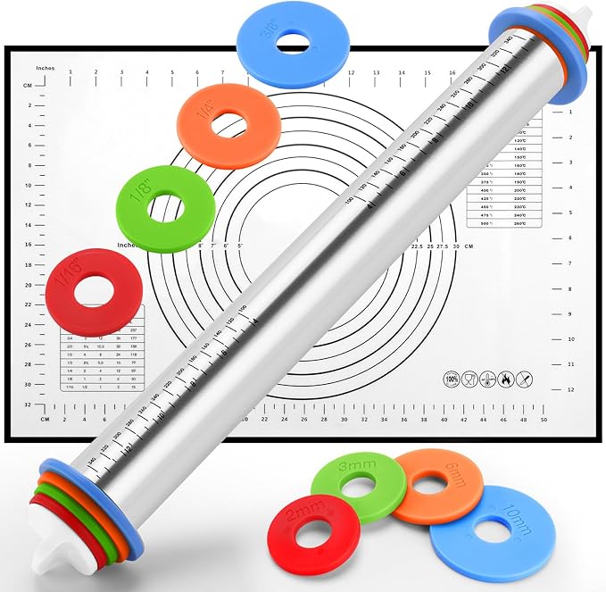 Rolling Pin nonstick and Silicone Baking Pastry Mat combo kit, Adjustable Rolling Pin With Thickness Ringsfor Baking Fondant, Pizza, Pie, Pastry, Pasta, Dough, Cookies (black)