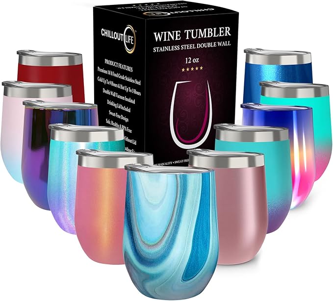 CHILLOUT LIFE 12 oz Stainless Steel Wine Tumbler with Lid - Double Wall Vacuum Insulated Wine Cup Glass Keeping Cold & Hot for Coffee, Champagne, Cocktails, Ice Cream