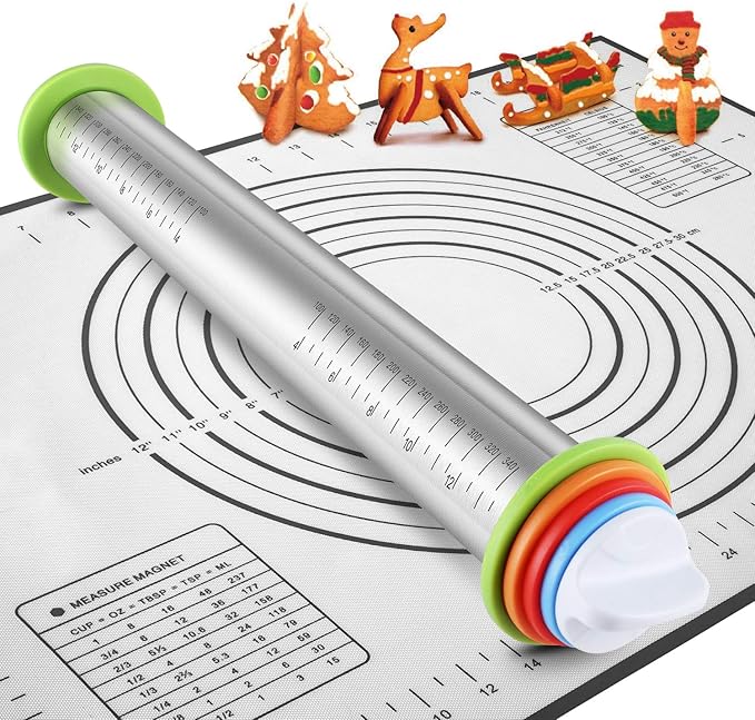 Rolling Pins, Stainless Steel Dough Roller, Rolling Pin and Silicone Baking Pastry Mat Set, Adjustable Rolling Pin with Thickness Rings for Baking Dough, Pizza, Pie, Pastries, Pasta, Cookies(Black)
