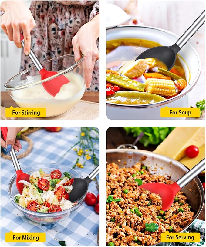 Pack of 2 Large Silicone Cooking Spoon Non Stick Solid Basting Spoons Heat-Resistant Kitchen Utensils for Mixing Serving (Black-Red)