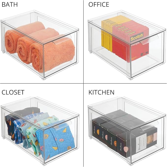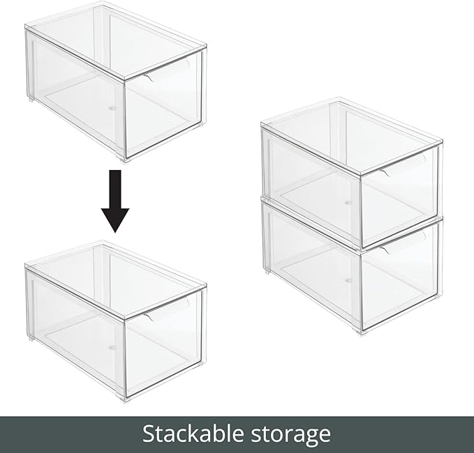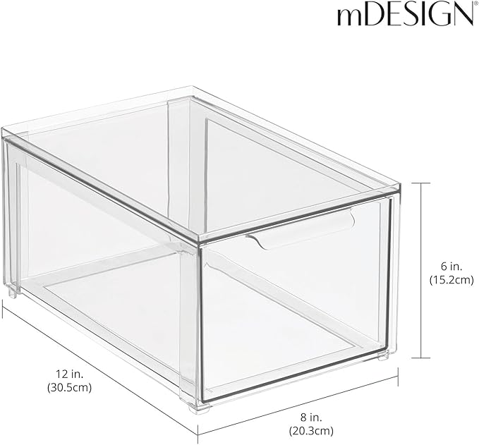 mDesign Plastic Stackable Closet Storage Organizer Bins with Pull Out Drawer for Cabinet, Desk, Shelf, Cupboard, or Dresser Organization - Lumiere Collection - 4 Pack - Clear