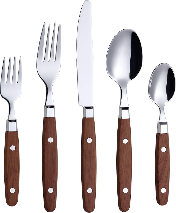 ANNOVA Silverware Set, Retro/Rivet Colorful Stainless Steel Tableware Kitchen Flatware Set Utensils, Includes Dinner Knives, Forks, Spoons, Salad Forks & Dessert Spoons (Wood, 20 Pieces)