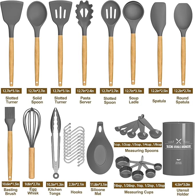Umite Chef Kitchen Cooking Utensils Set, 33 pcs Non-stick Silicone Utensils Spatula Set with Holder, Wooden Handle Heat Resistant Silicone Kitchen Gadgets Utensil Set (Gray)