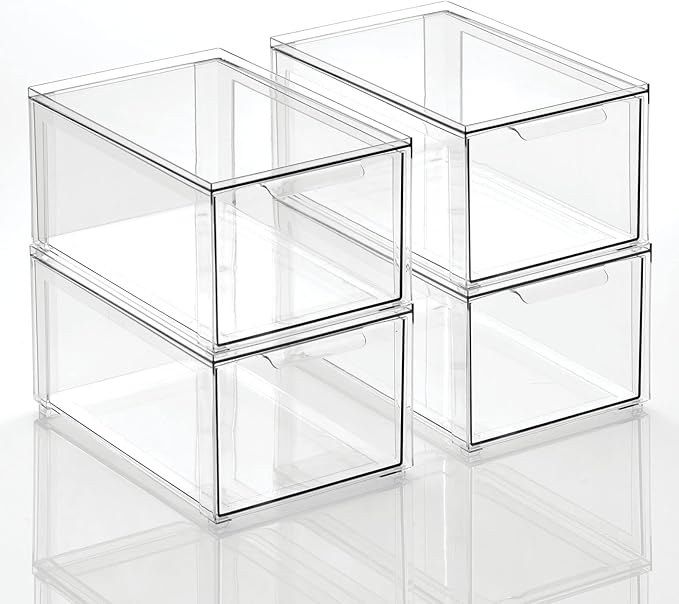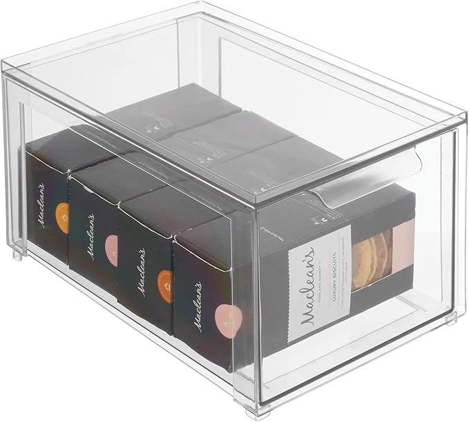mDesign Plastic Pantry Organization and Storage Bin w/Pull Out Drawer - Stackable Kitchen Supplies Storage Container for Organizing Cabinet, Fridge, Freezer - Lumiere Collection - 4 Pack, Clear