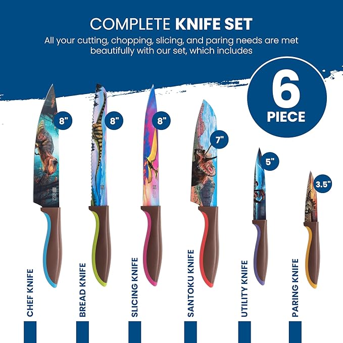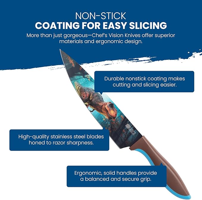 CHEF'S VISION Jurassic Knife Set - 6-Piece Stainless Steel Cutting Knives Set for Kitchen - Stunning Dinosaur Designs, Great Gift for Women or Men - Unique Kitchen Knife Set Gift