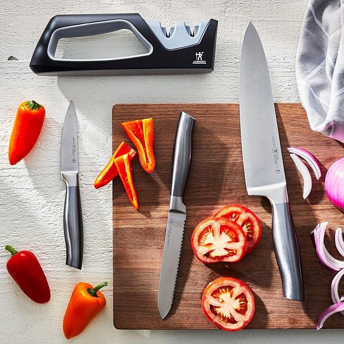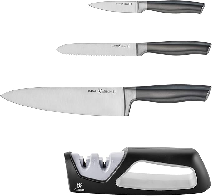 HENCKELS Graphite 4-pc Starter Knife Set, 8" Chef Knife, 5-in. Serrated Utility, 3-in. Paring Knife, and Handheld Sharpener