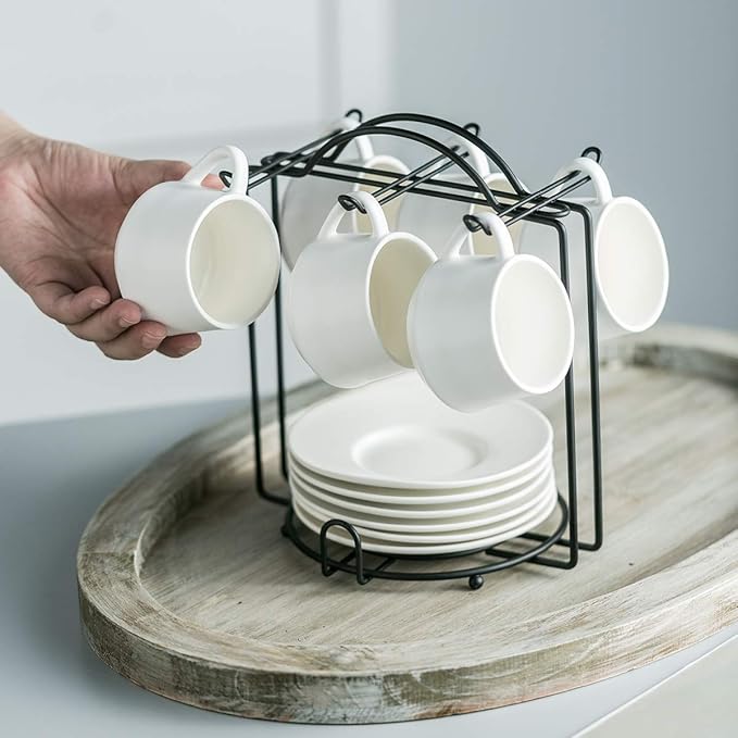 YHOSSEUN Espresso Cups Set with Saucers and Metal Stand Coffee Cup Set of 6 4 oz Cappuccino Cups Teacup for Tea Party - White