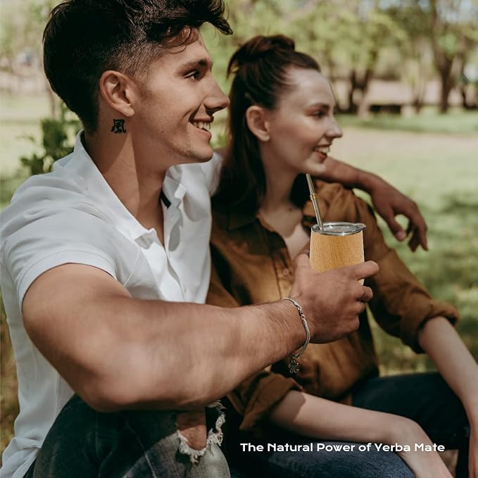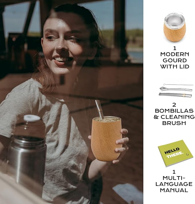 BALIBETOV 5 pcs large Yerba Mate Cup and Bombilla Kit, Includes one 12 oz Yerba Mate Gourd with Lid, Two Bombillas Mate Straw and one cleaning brush | Stainless steel | Double Walled