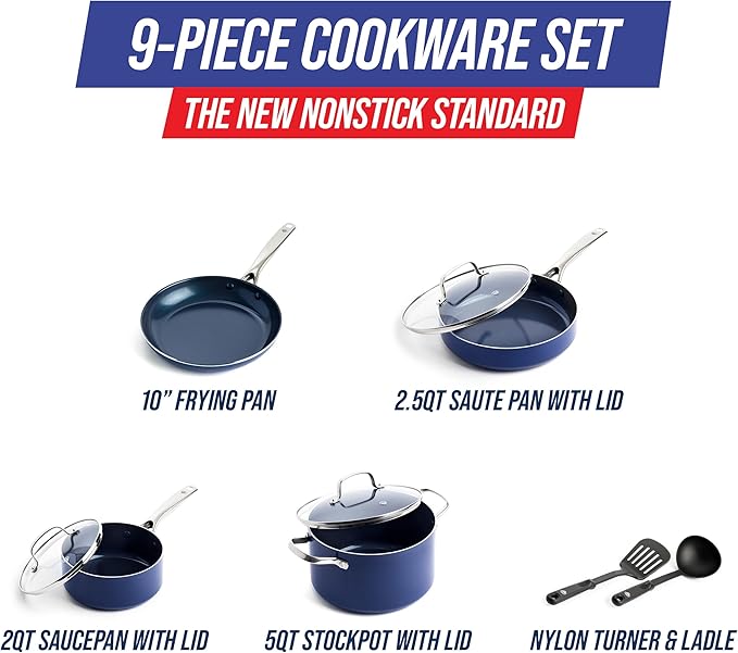 Blue Diamond 9 Piece Nonstick Cookware Set, Diamond Ceramic Pots & Pans, Dishwasher & Metal Utensil Safe, Non Toxic PFAS-Free, Kitchen Cooking Sauce & Saute Pans, Oven & Broiler to 600F, Blue