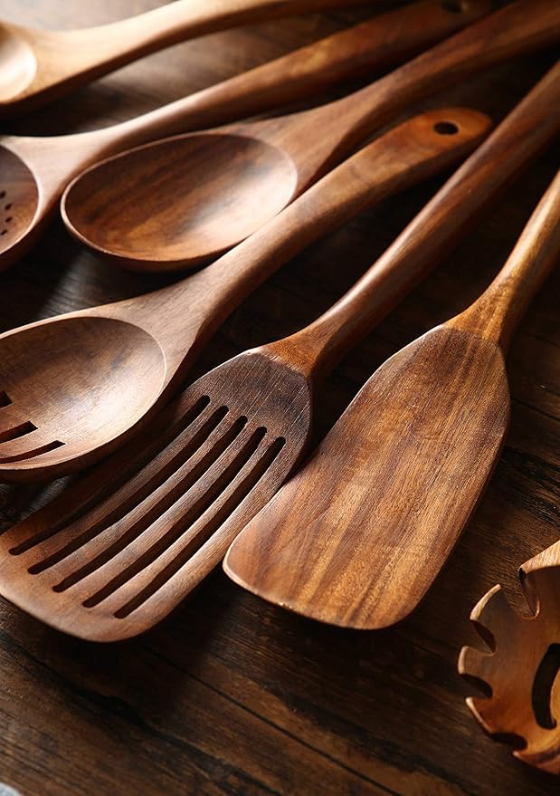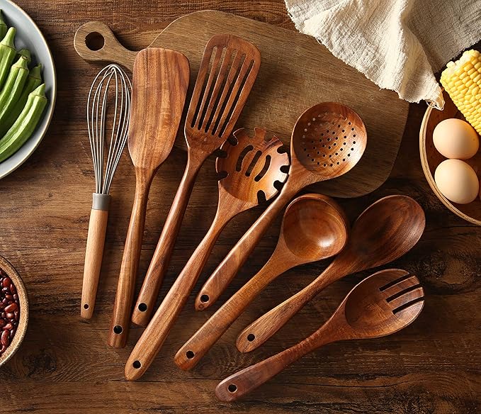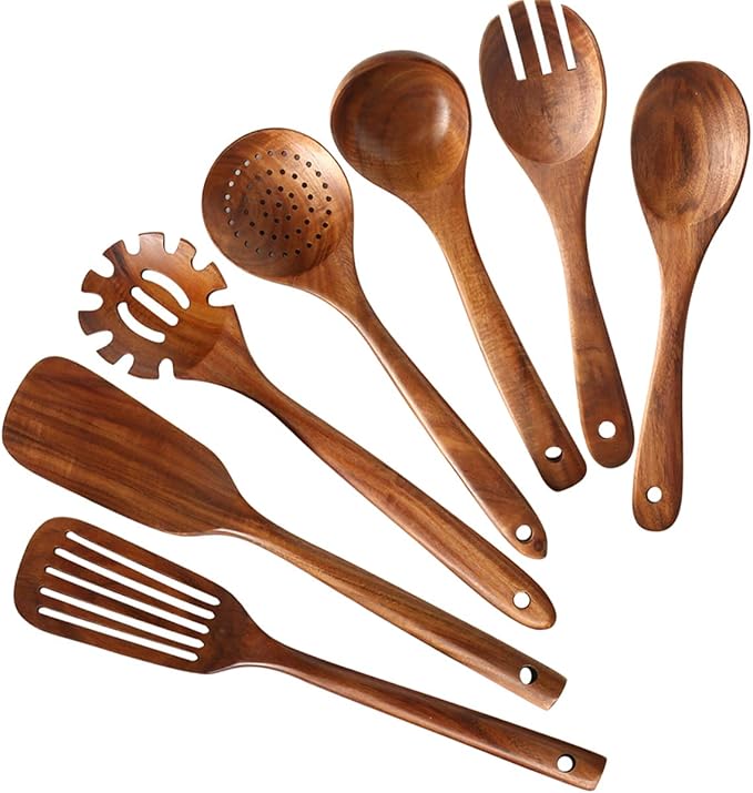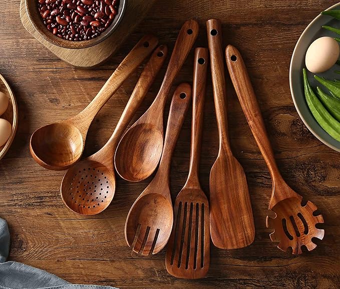 Wooden Kitchen Utensils set, 7Pcs Wooden Spoons for cooking Natural Teak Wood Kitchen Spatula Set for Cooking including Spoon Ladle Fork