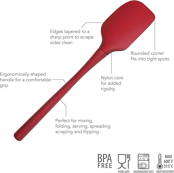 • TOUGH FLEX-CORE: Silicone head is reinforced with a sturdy nylon core for rigidity and strength. This combination offers a solid core that can tackle thick batters and hearty doughs while the flexible edges scrape the bowl clean.