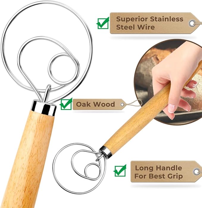 Danish Dough Whisk Bread Mixer,2 Pack Premium Stainless Steel Dutch Whisk With a Dough Scraper for Bread, Pastry or Pizza Dough - Perfect Baking