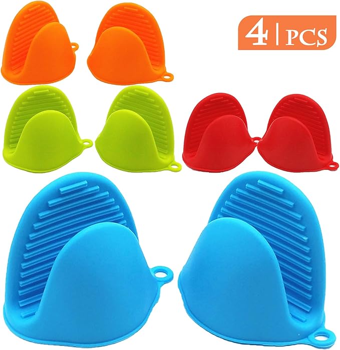 About This Quantity and Color: 4 Pairs Mini Oven Gloves, blue, green, red, orange High Quality Food Grade Materials: Silicone... Read more