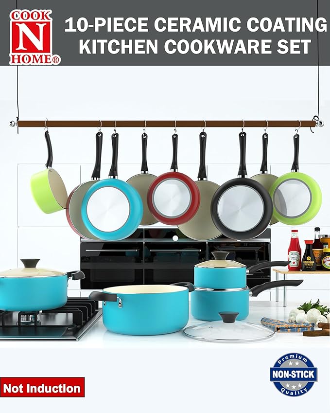 Cook N Home 10-Piece Ceramic Nonstick Cookware Set - Pots, Pans, Dutch Oven, Saucepans, Frying Pans and Lids - Turquoise