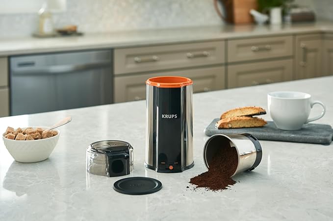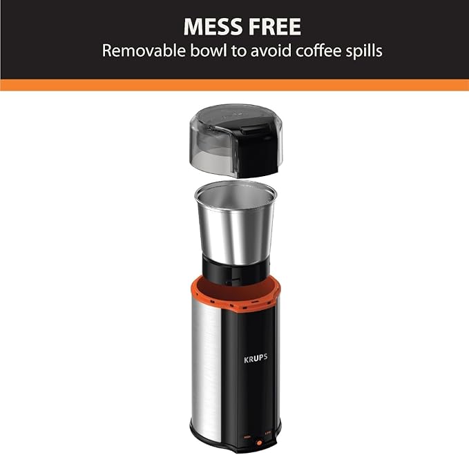 KRUPS: 3oz Coffee Grinder, Ultimate Silent Vortex Plastic and Stainless Steel Grinder with Removable Bowl Mess-Free, 8 Times Quieter, 2 Speeds 240 Watts,Dry Herbs,Dishwasher Safe,12 cups ground Silver