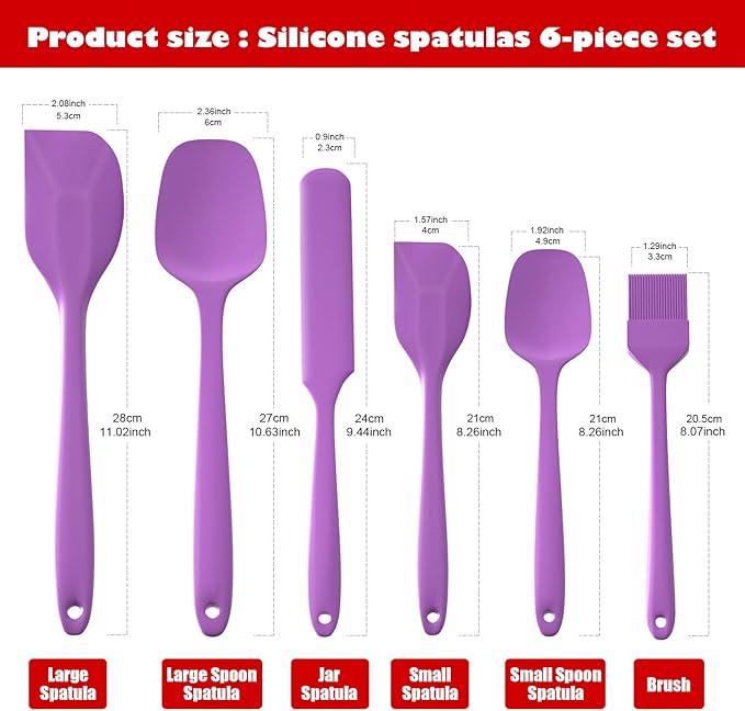 Heat Resistant Silicone Spatulas Set 6pcs, Seamless Design Non-Stick Mixing Spatulas with Stainless Steel Core, Premium BPA-Free Rubber Spatula Baking Cooking Utensile for Home Kitchen BBQ (purple)