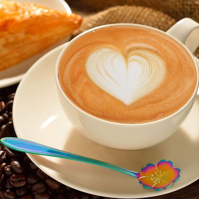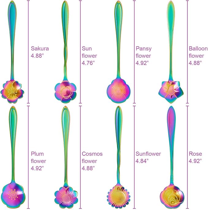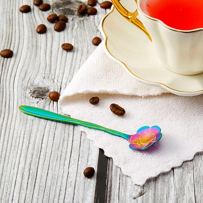 Chengu 8 Pieces Flower Coffee Tea Spoons Stainless Steel Sugar Spoons Tea Party Flower Fancy Tableware Set Stir Bar Creative Stirring Teaspoon, 8 Different Patterns(Rainbow Color)