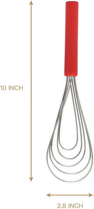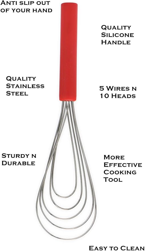 Flat Whisk Silicone Handle Non Slip 10" - 5 Wires Whisk with 10 Heads for Kitchen Cooking Color Red by Jell-Cell