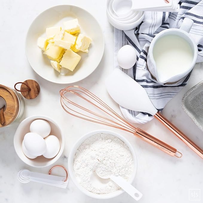 White Silicone and Copper Kitchen Utensils Set with Holder - 17-Piece Rose Gold Cooking Tools for Nonstick Cookware, with Measuring Cups, Spoons, & Utensil Holder - Stylish Copper Kitchen Accessories