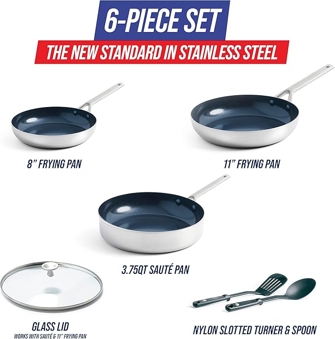 Blue Diamond Cookware Tri-Ply Stainless Steel Ceramic Nonstick, 6 Piece Cookware Pots and Pans Set, PFAS-Free, Multi Clad, Induction, Dishwasher Safe, Oven Safe, Silver