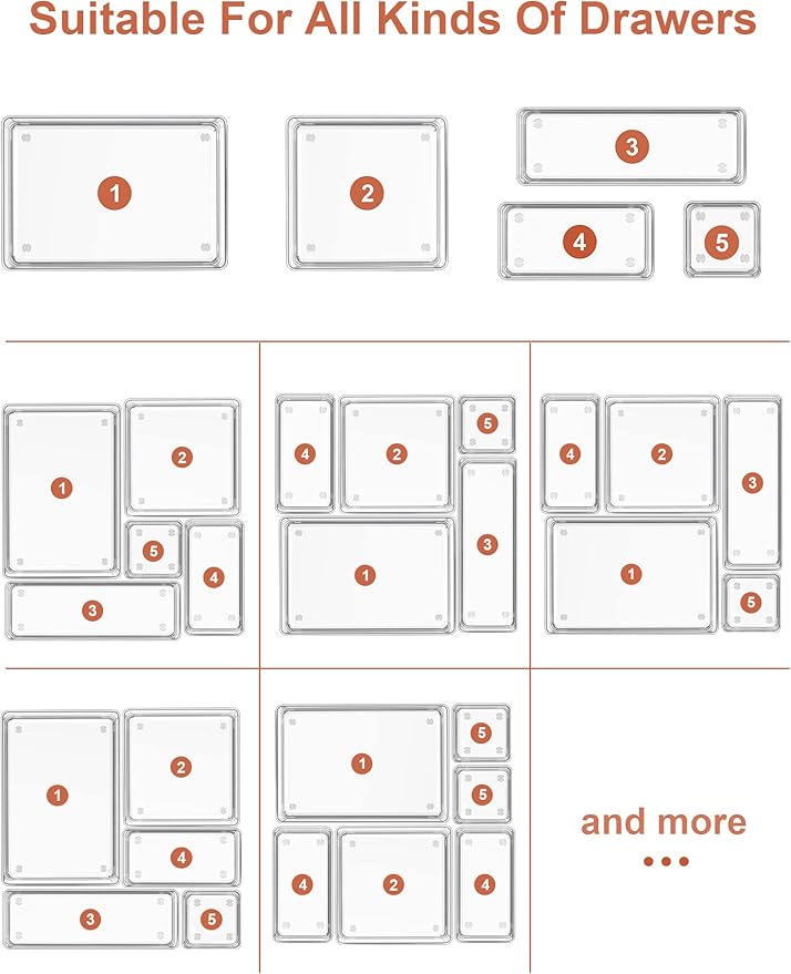 SMARTAKE 16-Piece Drawer Organizer with Non-Slip Silicone Pads, 5-Size Desk Storage Tray for Makeup, Jewelries, Utensils in Bedroom Dresser, Office and Kitchen, Clear