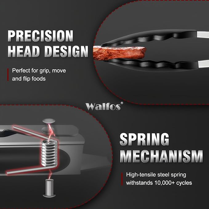 Walfos Kitchen Tongs - Heat Resistant Cooking Tongs Set of 3, Stainless Steel and BPA Free Silicone Tips, Great for Cooking, Grilling, Turning, 7" 9" and 12" (3 black silicone tongs)