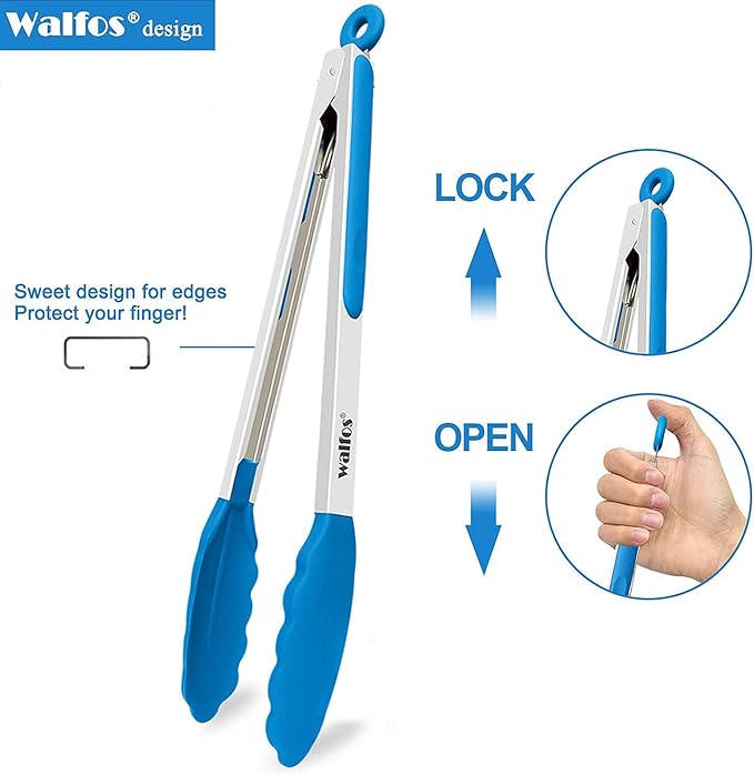 Walfos Kitchen Tongs - 7" 9" and 12" Heat Resistant Food tongs, Thickened Stainless Steel and BPA Free Silicone Tips, Great for Cooking, Grilling, Turning, Dishwasher safe(3 blue silicone tongs)
