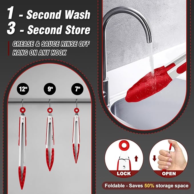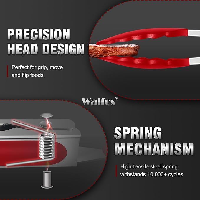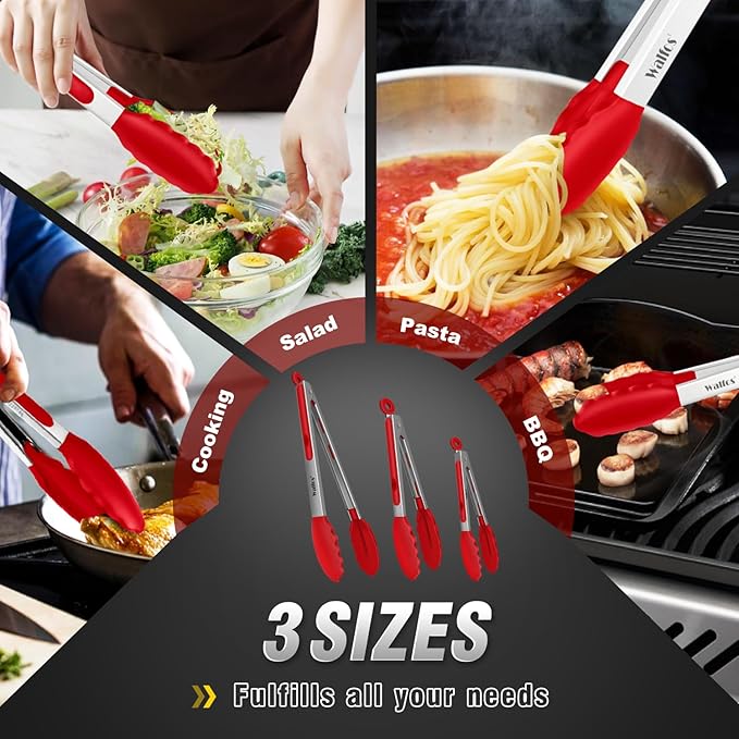 Walfos Kitchen Tongs - 7" 9" and 12" Heat Resistant Cooking Tongs, Stainless Steel and BPA Free Silicone Tips, Great for Cooking, Salad, Grilling, Turning, Dishwasher safe,set of 3