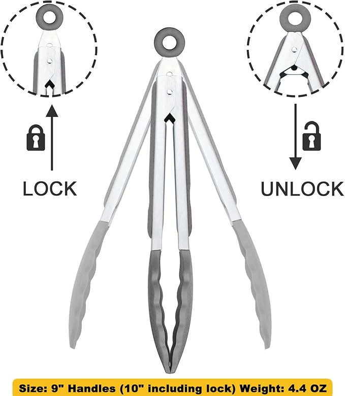 Locking Kitchen Tongs with Silicon Tips 9-Inch Stainless Steel Grilling Tongs, Set of 3 (Gray)