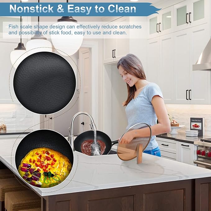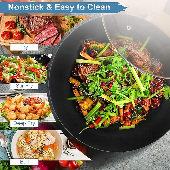 Carbon Steel Wok Pan with Lid & Wood Spatula, 12.5" Cast Iron Stir Fry Pan with Flat Bottom and Wooden Handle for Electric, Induction and Gas Stoves