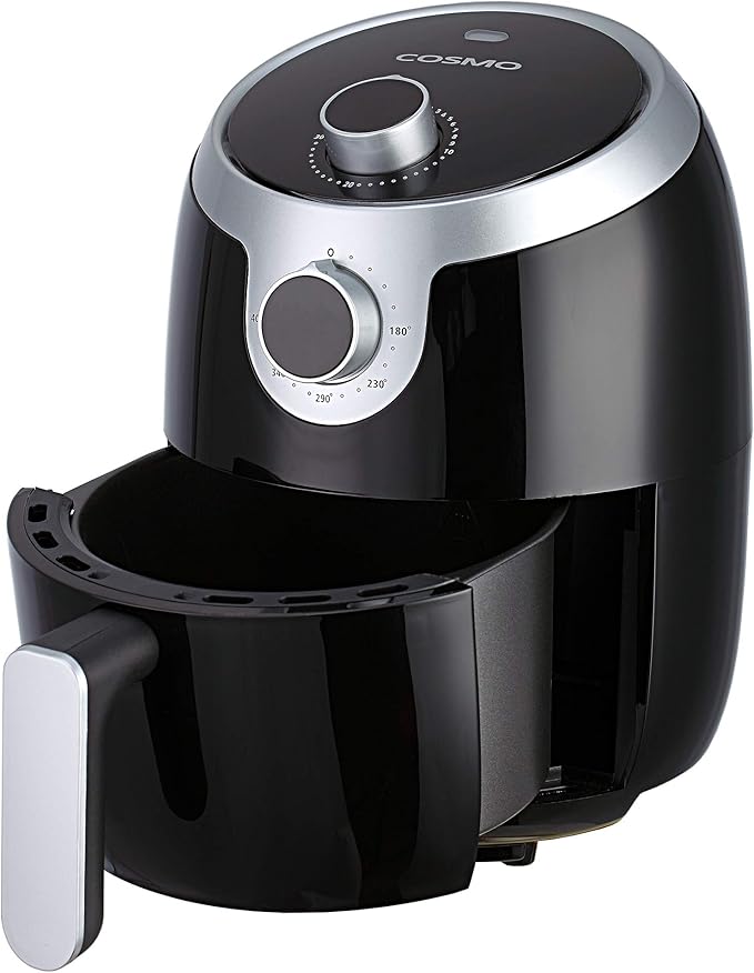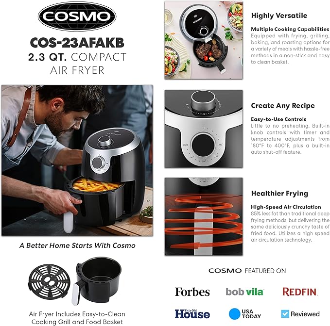 COSMO COS-23AFAKB 2.3 Quart Electric Small Air Fryer with Temperature Control, Timer, Auto Shut-Off, Non-Stick Frying Tray, 1000W Compact Mini Air Fryer (2.3 Quarts, Stainless Steel/Black)