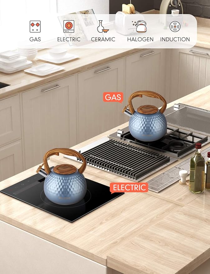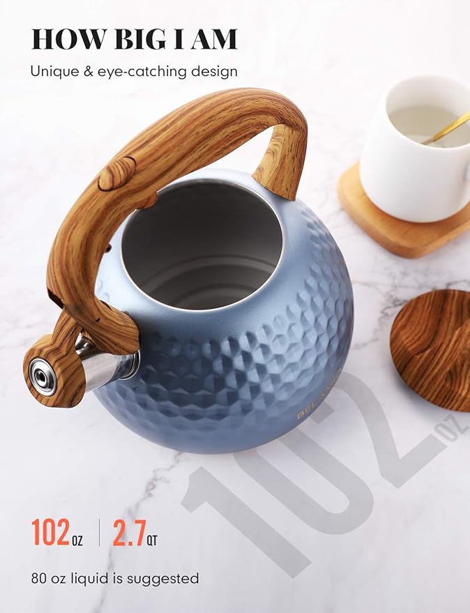 BELANKO 2.7 Quart Tea Kettle for Stovetop - Food Grade Stainless Steel with Diamond Texture, Designer Teapot Look, Cool-Touch Wood Pattern Handle, Whistling Spout - Glacier Blue