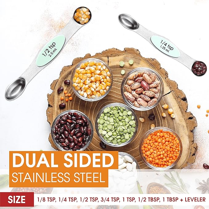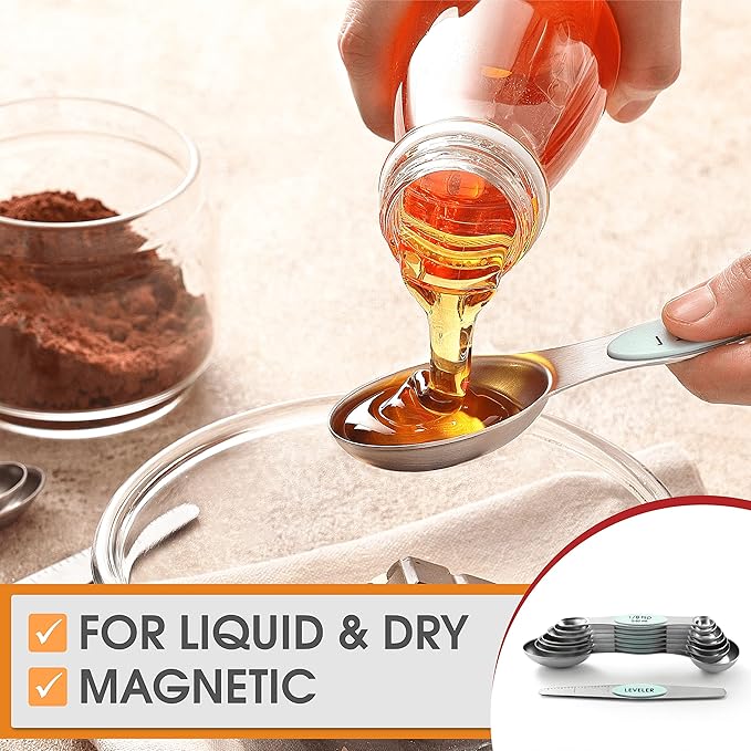 Spring Chef Stainless Steel Magnetic Measuring Spoons Set of 8 with Leveler, Nesting Metal Teaspoon & Tablespoon Measuring Spoons, Kitchen Gadgets for Baking & Cooking, Fits in Spice Jars - Mint