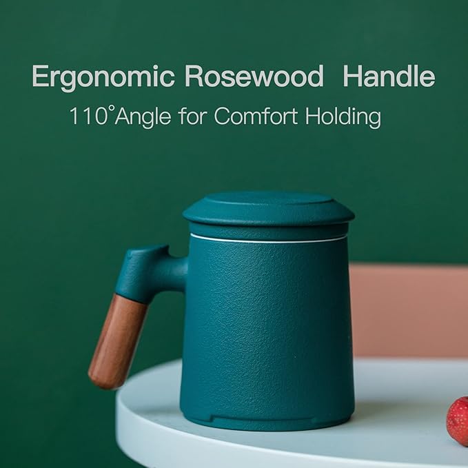 ZENS Tea Cup with Infuser and Lid, 12oz Green Tea Mug for Loose Leaf Tea Steeper, Wood Handle Tea Cup with Fine Tea Strainers Hot Diffusers, Ceramic Mugs Accessories for Tea Lovers Gifts