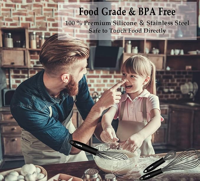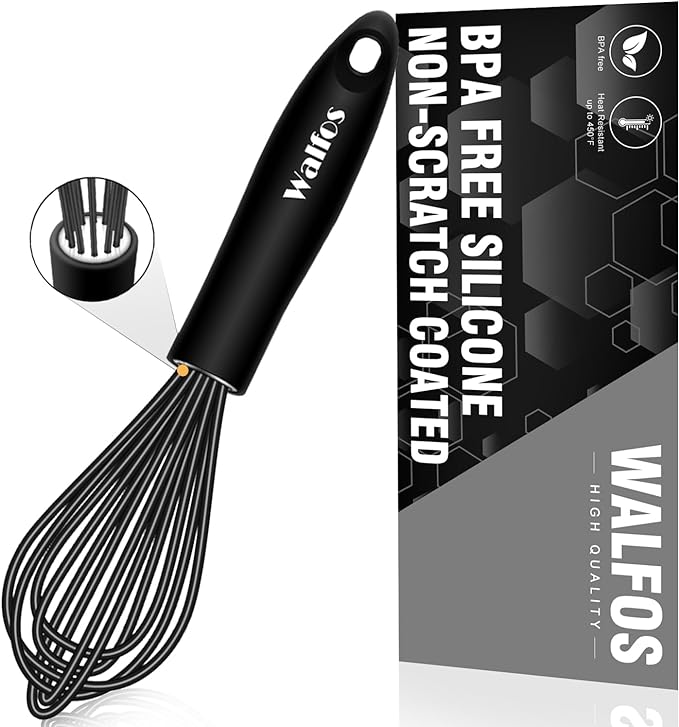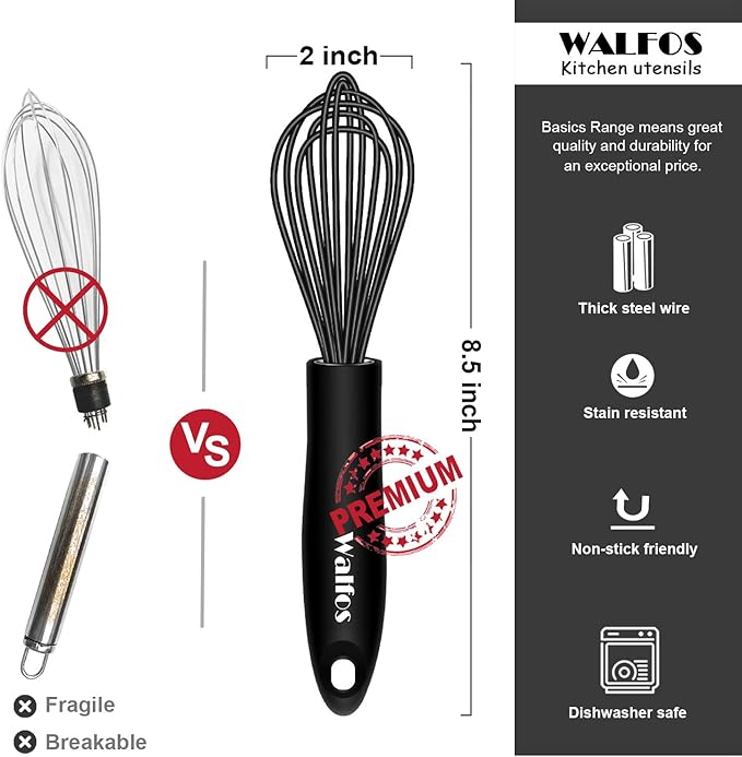Walfos Silicone Whisk, Stainless Steel Wire Whisk - Heat Resistant Kitchen Whisks for Non-stick Cookware, Balloon Egg Beater Perfect for Blending, Whisking, Beating, Frothing & Stirring, 8.5", Black