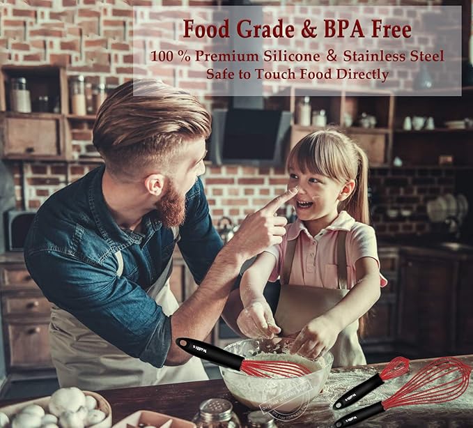 Walfos Whisk,Silicone Whisks- Heat Resistant(480°F) Silicone Whisks for Cooking Non Scratch,BPA free and Dishwasher Safe.Perfect for Blending,Whisking,Beating, Set of 3(Red)