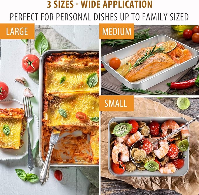 E-far Baking Pans Set of 3, Stainless Steel Sheet Cake Pan for Oven - 12.5/10.5/9.4Inch, Rectangle Bakeware Set for Cake Lasagna Brownie Casserole Cookie, Non-toxic & Healthy, Dishwasher Safe