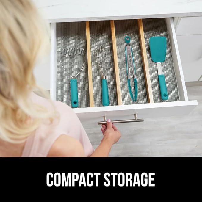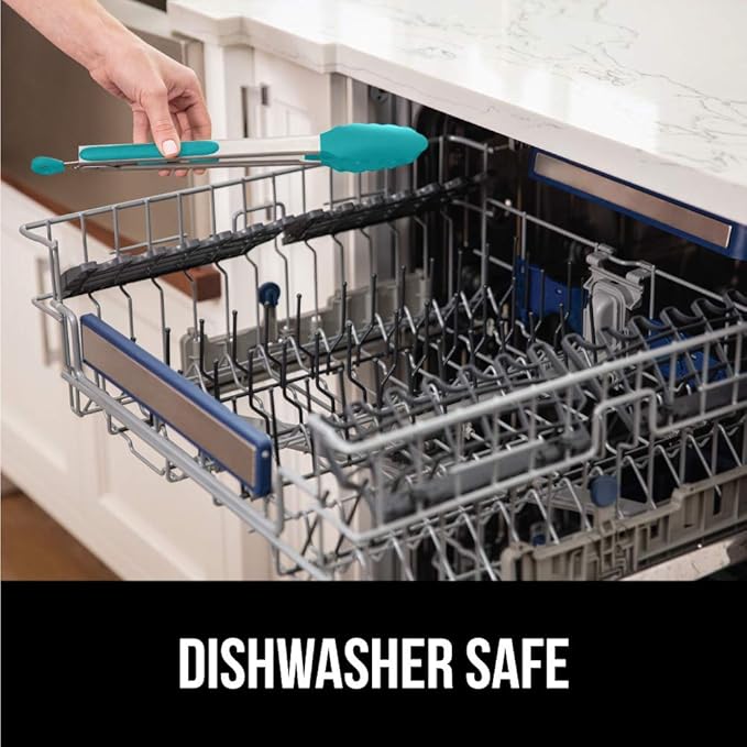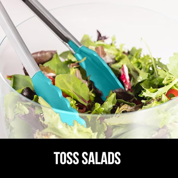 GORILLA GRIP Stainless Steel Heat Resistant Kitchen Tongs for Cooking, 9 + 12 Inch, Set of 2 BBQ Tong, Non Scratch Silicone Tip for Pan, Strong Grip, Grab Food, Salad, Air Fryer, Pull Lock, Turquoise