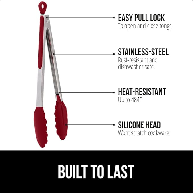 GORILLA GRIP Stainless Steel Heat Resistant Kitchen Tongs for Cooking, 9 + 12 Inch, Set of 2 BBQ Tong, Non Scratch Silicone Tip for Pan, Strong Grip, Grab Food, Toss Salad, Air Fryer, Pull Lock, Red