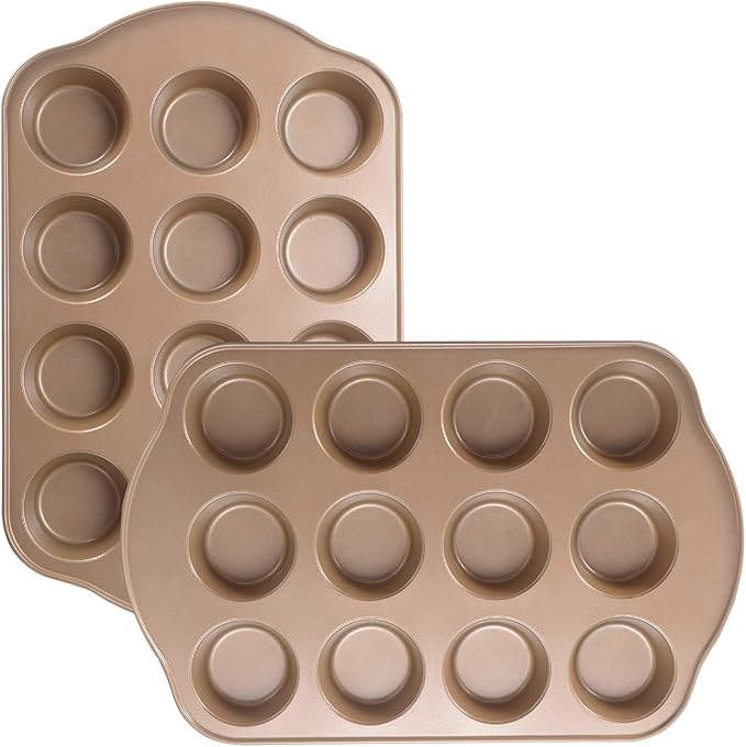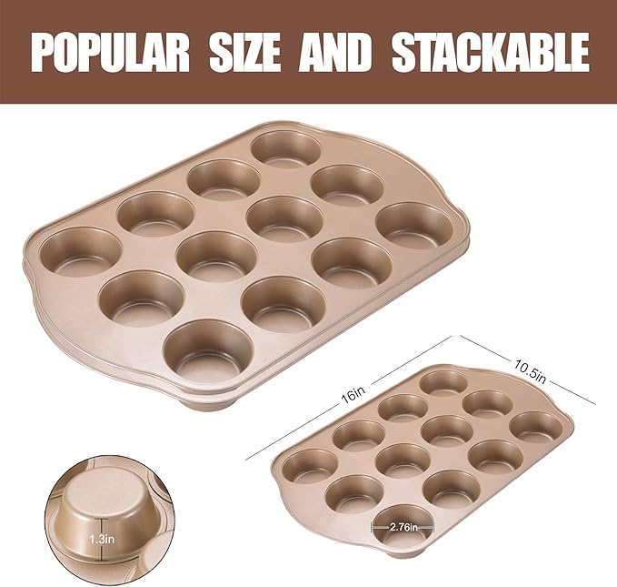 2 Pack Nonstick Muffin Pan Set, 12-Cup Heavy Duty Cupcake Baking Pan with Handles - PFOA-Free Muffin Tin, Rust Proof & Warp Resistant, Oven Safe 430°F (Gold)