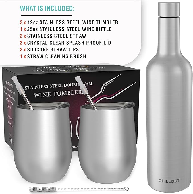 CHILLOUT LIFE 12 oz Stainless Steel Wine Tumblers 2 Pack & 1 Insulated Wine Bottle - Double Wall Vacuum Insulated Wine Glasses Cups with Lids and Straws Set Keeping Cold & Hot Gift Set