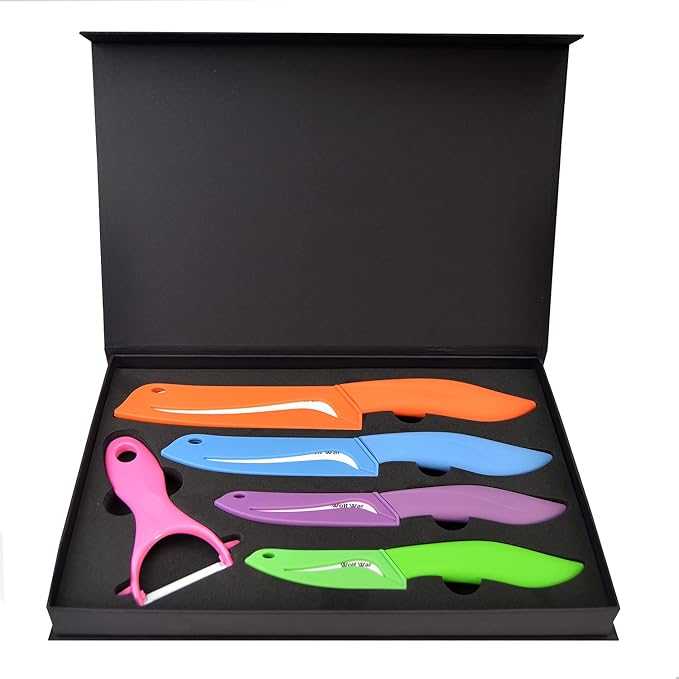 Ceramic Knife Set with Sheaths - Black 5 Piece Kitchen Set: 6" Chef, 5" Utility, 4" Fruit, 3" Paring Knife, One Peeler