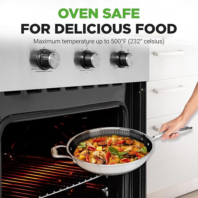 NutriChef 12" Stainless Steel Wok - Induction ready, Non Stick Tri-ply technology, Scratch-resistant Honeycomb Fire Textured Pattern