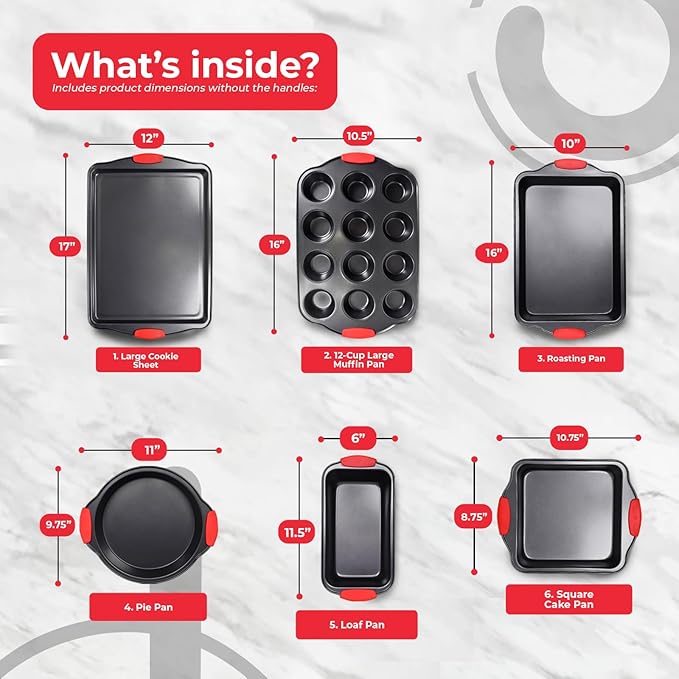 PERLLI Non-Stick 6-Piece Baking Pan Set, BPA-Free Carbon Steel Bakeware Set with Silicone Handles, Stackable Kitchen Oven Set, Cookie Sheet, Baking Tray, Baking Sheet Set, Oven Safe (446°F)