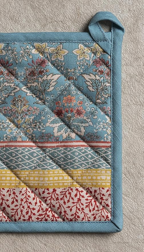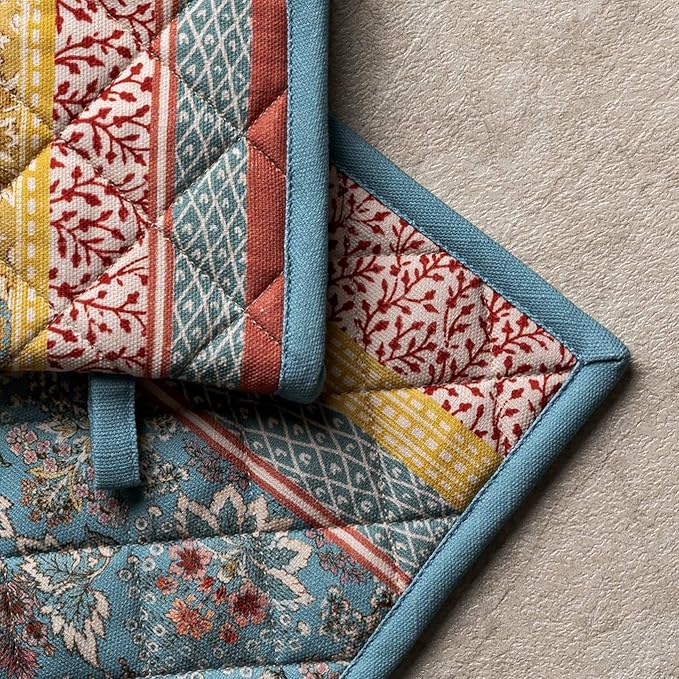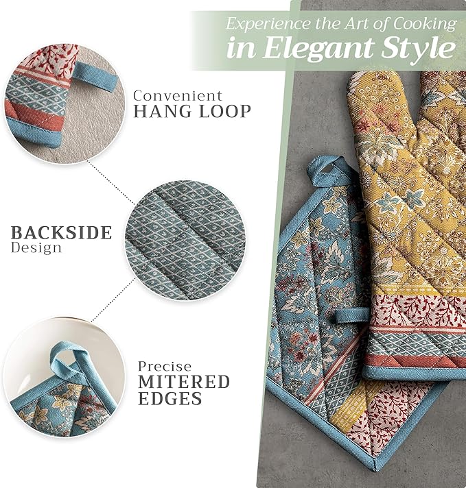 Maison d' Hermine 100% Cotton Oven Mitt & Pot Holder Set (7.5"x13" & 8"x8") Heat Resistant BBQ Cooking Gloves with Loop, Baking, Grilling, Kitchen, Handling Hot Pans Spring/Summer (Marquise)