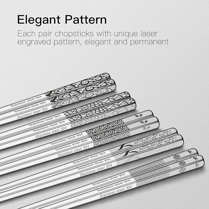 Metal Chopsticks Reusable 18/8 Stainless Steel Chopsticks Multipack Dishwasher Safe Chop Sticks Cute Laser Engraved Non-slip Japanese Korean Chopstick for Cooking Eating 9 1/4 Inches 5 Pairs Gift Set