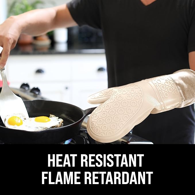 BPA-Free Silicone Oven Mitts Ultra Heat Resistant up to 500°F - Oven Mitts with Thick Cotton Liner - Long Slip Resistant Pot Holders, Flexible Oven Gloves - Beige 14.7