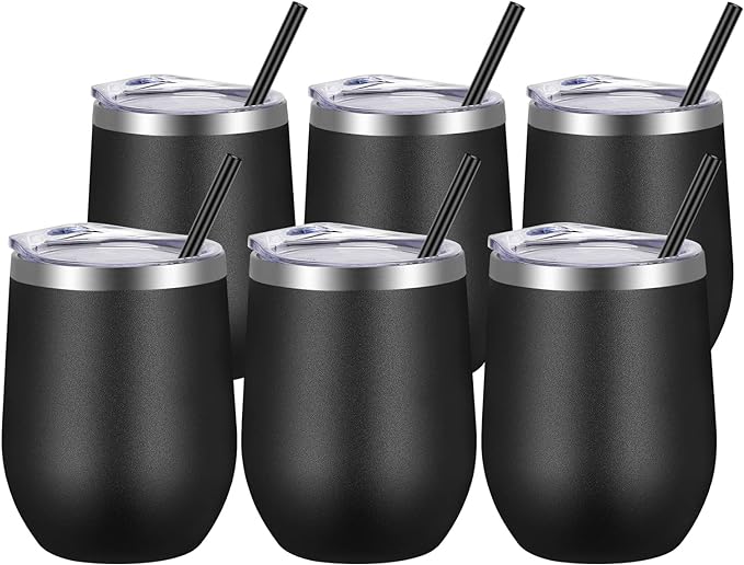 VEGOND Wine Tumblers Bulk 6 Pack, 12oz Stainless Steel Stemless Wine Glass with Lids and Straws, Double Wall Vacuum Insulated Tumbler Cup, Coffee Mug for Cold Hot Drinks