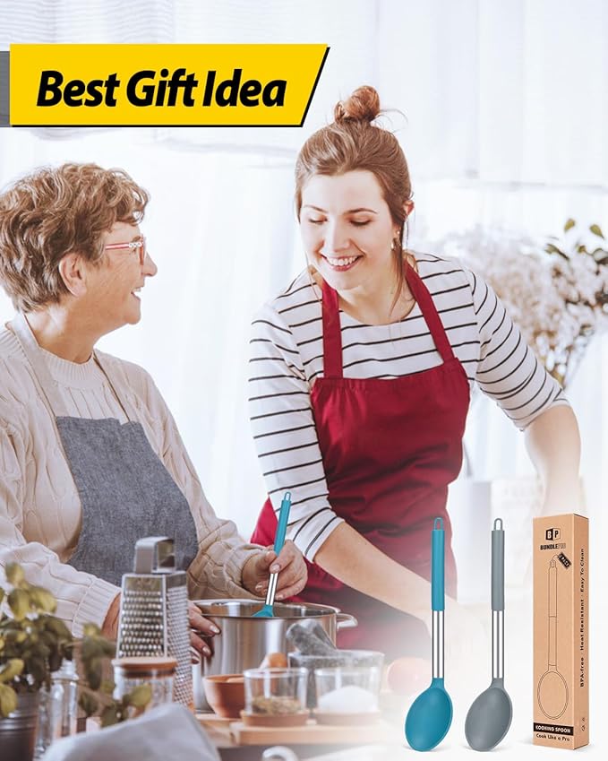 Pack of 2 Large Silicone Cooking Spoon Non Stick Solid Basting Spoons Heat-Resistant Kitchen Utensils for Mixing Serving (Gray-Blue)