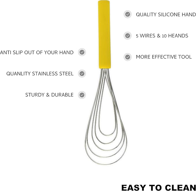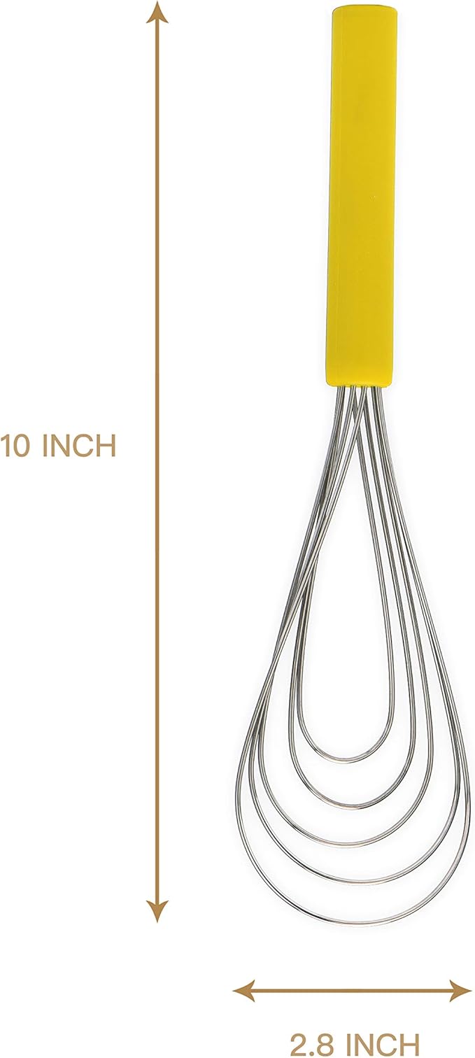 Flat Whisk Silicone Handle Non Slip 10" - 5 Wires Whisk with 10 Heads for Kitchen Cooking by Jell-Cell (Yellow)